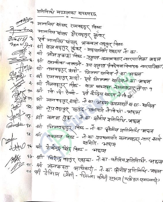 उक्त प्रतिनिधी मण्डलमा प्रतिनिधी सभा सदस्य राम बहादुर बिष्ट, राष्टिय सभा सदस्य शेर बहादुर कुवँर, पूर्व सांसद अक्कल बहादुर बिष्ट, कांग्रेस महासमिती सदस्य बल बहादुर कुवँर, कमलबजार नगपालिकाका नगर प्रमुख ओम प्रकाश बिष्ट लगायत १९ जना अछामका नेता कार्यकर्ताहरुको सहभागीता रहेको थियो ।