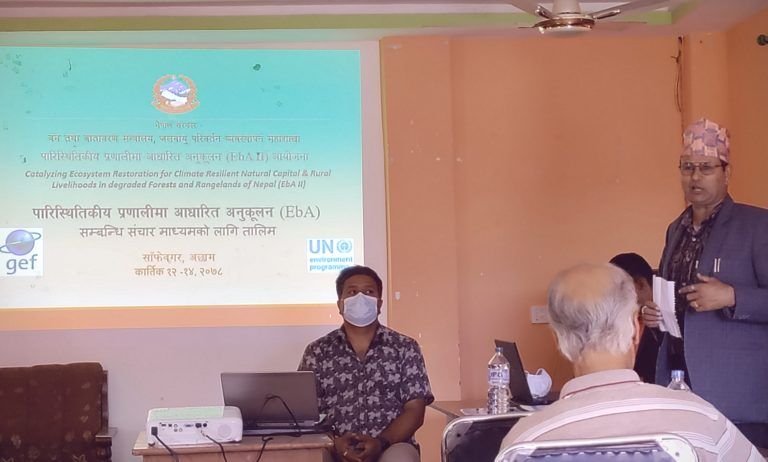 अछाम । पारिस्थितिकीय प्रणालीमा आधारित अनुकूल कार्यक्रम सम्बन्धी ३ दिने तालिम अछामको साँफेबगरमा सुरु भएको छ । अछाम जिल्लामा कार्यरत पत्रकारहरुको लागि सो विषय सम्बन्धी क्षमता अभिवृद्धिका लागि तालिम सुरु भएको हो ।