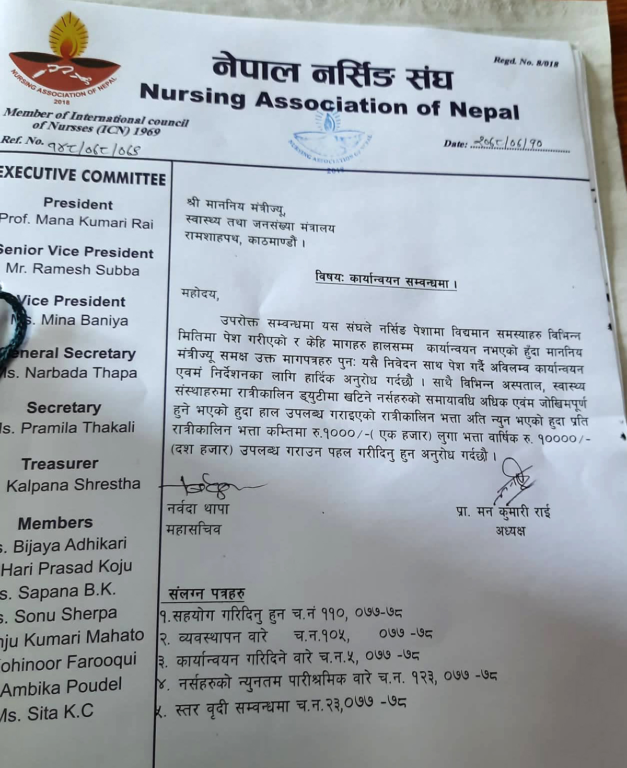 संघका पदाधिकारीले मंगलबार मन्त्रीलाई ज्ञापनपत्र बुझाउन बुझाएका थिए। विभिन्न अस्पताल, स्वास्थ्य संस्थामा रात्रीकालिन ड्युटी खटिने नर्सको समायावधि अधिंक एवं जोखिमपूर्ण भएकाले रात्रीकालिन भत्ता वृद्धिकोमा गरिएको संघले जनाएको छ।