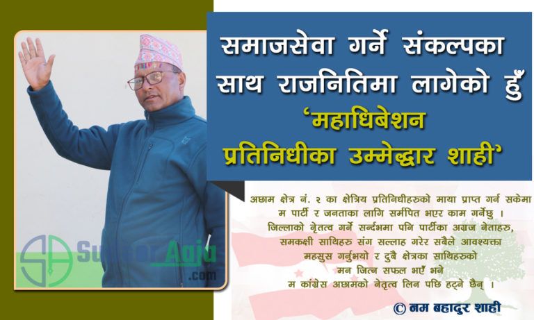 कांग्रेस अछाम क्षेत्र नं. २ को क्षेत्रिय सचिव, क्षेत्रिय सभापती हुदैँ पार्टीको १३ आँै महाधिबेशनको जिल्ला अधिबेशनमा जिल्ला सचिवमा निर्वाचित भए । सचिव निर्वाचित भएपछि पार्टीको संगठन विस्तार गर्न, बिद्यान सम्बत संचालन गरी पार्टी बलियो बनाउने संकल्पका साथ पार्टीको होल टाईमर कार्यकर्ताको रुपमा रहेको दावी गर्ने नेता शाहीले १४ औँ महाधिबेशनमा आफुलाई केन्द्रिय महाधिबेशन प्रतिनिधीका रुपमा अघि सारेका छन् । नेता शाही संग सुदूरआजले गरेको कुराकानी ।