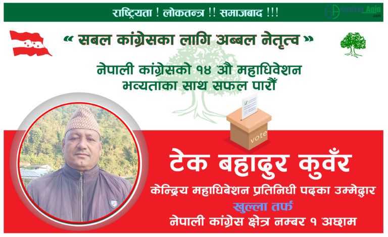 अछाम । नेपाली कांग्रेसका नेता टेक बहादुर कुवँरले आफ्नो उम्मेद्धारी घोषणा गरेका छन् । उनले १४ औँ महाधिबेशनका लागि महाधिबेशन प्रतिनिधीमा उम्मेद्धारी घोषणा गरेका हुन् ।