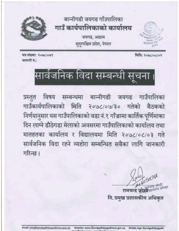 कार्तिक शुक्ल पूर्णिमाका दिन बान्नीगढी जयगढ गाउँपालिका वडा नं १ गाज्रामा लाग्ने एतिहासिक डौढेगडा मेलाको अवसरमा गाउँपालिकामा सार्वजनिक बिदा दिईएको पालिकाले जनाएको छ।