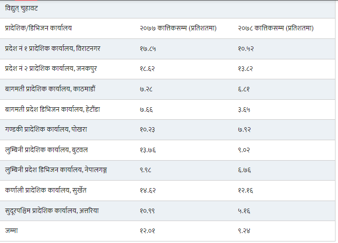 विद्युत् प्राधिकरणका सातैवटा प्रादेशिक तथा डिभिजन कार्यालयले चुहावट घटाएको देखिएको छ। यद्यपि सुदूरपश्चिम प्रदेशले गत वर्षको चुहावटको हिसाबले आधा घटाएको देखिएको छ।