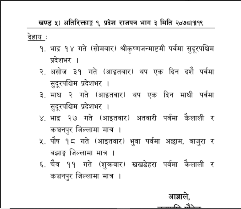 अछाम । आईतबार सुदूरपश्चिमका ३ जिल्लामा सार्वजनिक बिदा हुने भएको छ । सुदूरपश्चिम प्रदेश सरकारले भुवा पर्वको अवसरमा अछाम, बाजुरा र बझांग जिल्लामा सार्वजिनक बिदा दिने निर्णय गरेको हो ।