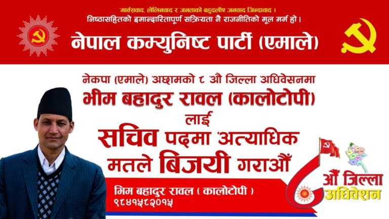 सचिव पदका उम्मेदवार रावल सरलता, निष्ठा र इमान्दारीता र सुदृढ संगठन आठौ जिल्ला सम्मेलनमा भीम रावल (कालोटोपी)लाई मतदान भन्ने नारा सहित प्रकाश शाह प्यानलबाट उम्मेदवार बनेका छन ।