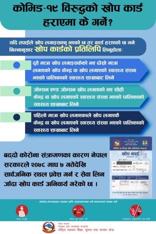 त्यसैले खोप कार्ड हराएमा स्वास्थ्य तथा जनसङ्ख्या मन्त्रालयले खोप कार्डको प्रतिलिपि उपलब्ध गराउने भएको छ ।