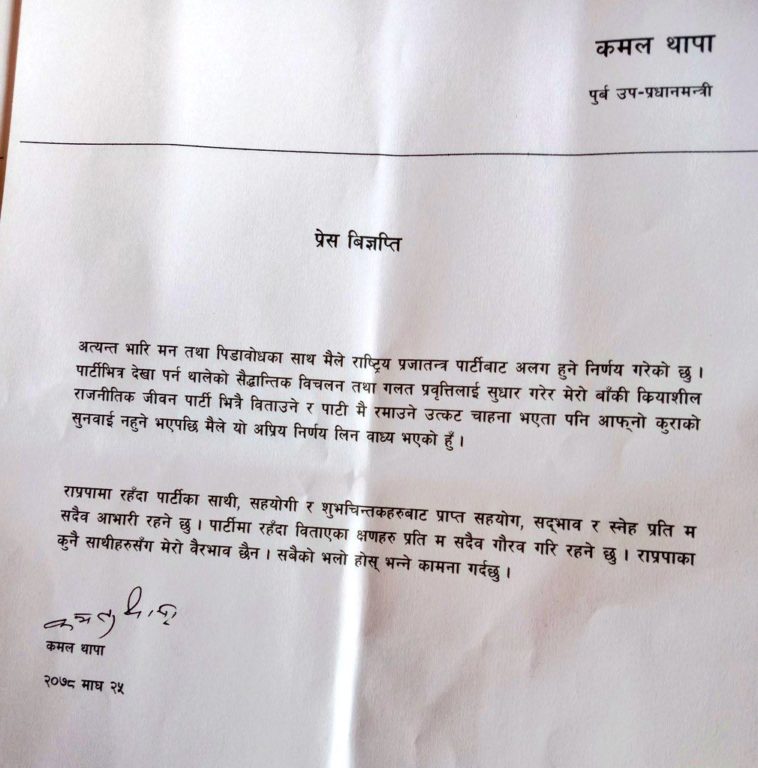 काठमाडौं– राष्ट्रिय प्रजातन्त्र पार्टीका निवर्तमान अध्यक्ष कमल थापाले पार्टीबाट अलग भएको घोषणा गरेका छन्। थापाले मंगलबार विज्ञप्ति जारी गर्दै आफू पार्टीबाट अलग भएको घोषणा गरेका हुन्। थापाले भनेका छन्, ‘अत्यन्त भारी मन तथा पीडाबोधका साथ मैले राष्ट्रिय प्रजातन्त्र पार्टीबाट अलग हुने निर्णय गरेको छ।’ थापाले पार्टीभित्र देखा पर्न थालेको सैद्धान्ख्तिक विचलन तथा गलत प्रवृत्तिलाई सुधार गर्ने उत्कट चाहना भए पनि आफ्नो कुराको सुनुवाइ नहुने भएपछि पार्टीबाटै अलग हुनुपरेको उनले विज्ञप्तिमा लेखेका छन्।