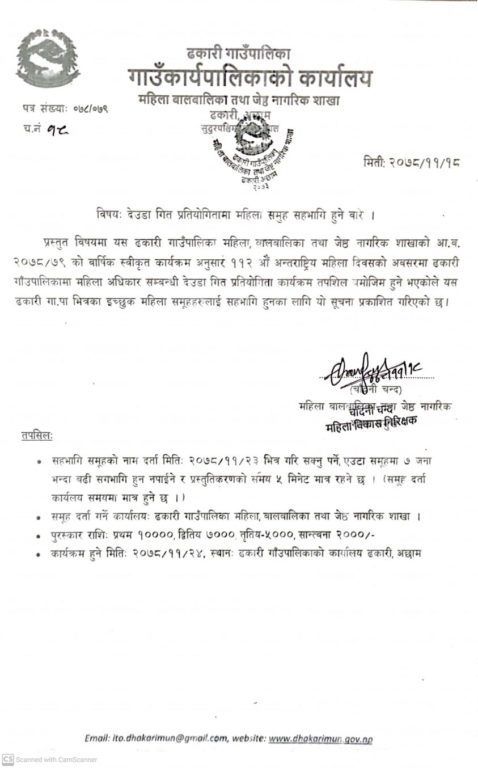 अछाम : जिल्लाको ढकारी गाउँपालिकामा महिला दिवसको अवसरमा देउडा गित प्रतियोगिता हुने भएको छ । महिला वालवालिका तथा जेष्ठ नागरिक शाखाको आयोजनामा महिला दिवसको अवसरमा महिला अधिकार सम्बन्धि देउडा प्रतियोगिता हुन लागेको हो ।