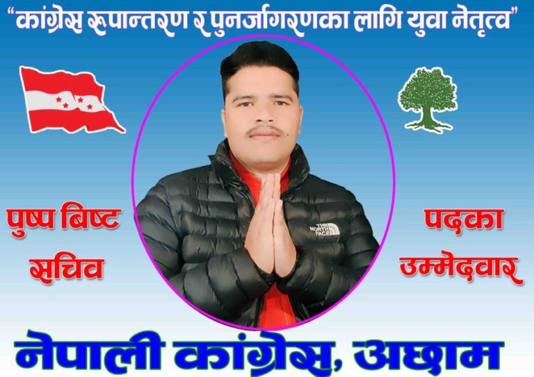 अछाम : नेपाली कांग्रेस अछामको सातौं जिल्ला अधिवेशन आज बाट सुरु भएको छ । जिल्लाको ९१ वडाका क्षेत्रिय प्रतिनिधिहरु सदरमुकाम मंगलसेन केन्द्रित भएका छन् । उम्मेदारी दिने क्रम सकिए संगै आज अन्तिम नामावली प्रकाशन भएको छ। निर्बाचनको यही सेरोफेरोका उम्मेद्धारको बिचमा चर्चित भएका छन् जिल्ला सचिव पदका उम्मेद्धार पुष्प विष्ट ।