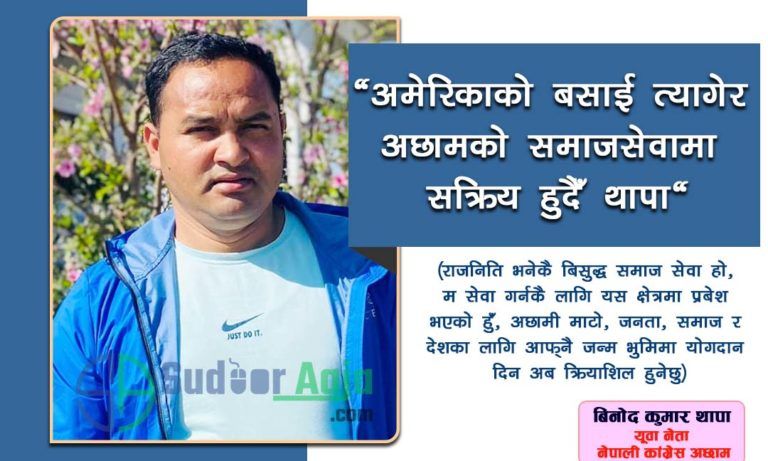 आफ्नै गाँउ ठाँउ र समाजको विकास तथा जनताका समस्या समाधान गर्न भनरे उनि क्रियाशिल भईरहेका छन् । मंगलसेन नगरपालिका बस्ती स्थायी घर भएका बिनोद कुमार थापा केही बर्ष अघि अछामबाट डिभी परेर अमेरिका गएका थिए । तर उनले अमेरिकााको बिलासी जीवन त्यागेर आफ्नै जिल्लमा फर्किएका छन् ।