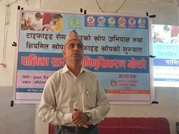 टाईफाईड रोग बिरुद्धको खोप अभियान तथा नियमित खोपमा टाईफाईड खोपको सुरुवात पालिका स्तरीय अभिमुखीकरण कार्यक्रममा बोल्दै नगर प्रमुख कँुवरले नगरपालिकाका ९५ प्रतिशत नागरीकलाई खोप लगाउने लक्ष्य रहेको बताए ।