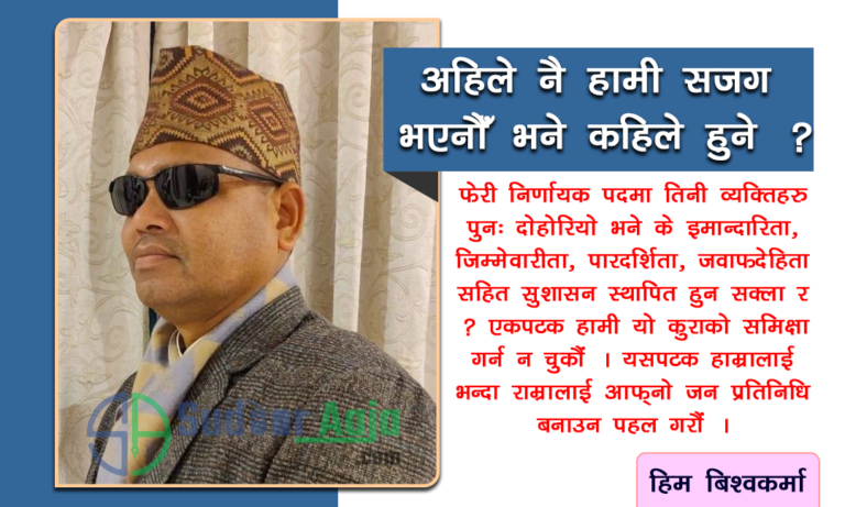 किन भने ? हाम्रो भविष्य हाम्रो आफ्नै हातमा छ । अबै हामी सजग भएनौ भने कहिले हुने । हरेक कुराको परिवर्तनमा हामीले जोड न दिए कस्ले दिने । नागरिक नै हरेक क्षेत्रको परिवर्तनका वाहक हुन्छन् । तसर्थ, हरेक गतिविधिलाई स्थिर भएर निहालौं, मनन् गरौं र अठोट निर्णयका साथ अगाडी बढौं । हामीले नगरे कसले, अब न गरे कहिले गर्ने । नागरिकको वास्तविक पहिचान भनेको गलत कुरालाई रोक्ने र असल कुरालाई आत्मसाथ गर्ने नै हो । होईन र ? धन्यवाद !