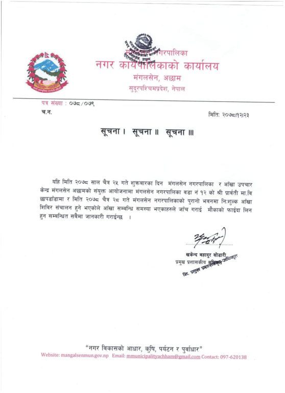 अछाम : जिल्लाको मंगलसेन नगरपालिकाले निशुल्क आँखा शिबिर संचालन गर्ने भएको छ । आँखा उपचार केन्द्र मंगलसेन संगको सहकार्यमा नगरपालकाका २ ठाँउमा निशुल्क शिबिर संचालन गर्ने भएको हो ।