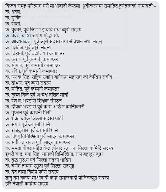 नेता राप्ती संगै पूर्व केन्द्रिय सदस्य हेमराज भट्टराई, संबिद्यान सभा सदस्य भगत बडुवाल मुक्ती, संबिद्यान सभा सदस्य हरिलाल थापा, घाईते अपांग संघका केन्द्रिय अध्यक्ष प्रेम बयक पर्वत, पूर्व डडेलधुरा ईन्चार्ज भरत धानुक पुकार लगायतका नेता कार्यकर्ता माओवादी केन्द्रमा समाहित भएका छन् ।
