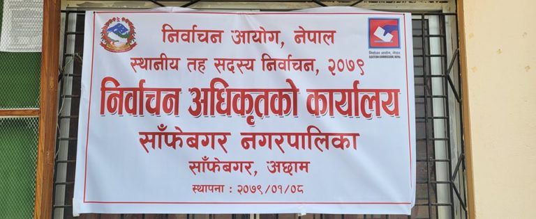अछाम : जिल्लाको प्रमुख व्यापारिक केन्द्र रहेको साँफेबगर नगरपालिकामा निर्वाचन अधिकृतको कार्यालय स्थापना भएको छ । स्थानिय तहको निर्वाचनको प्रयोजनार्थ निर्वाचन अधिकृतको कार्यालय स्थापना गरिएको सहायक निर्वाचन अधिकृत लक्ष्मी प्रसाद शर्मा ले बताएका छन् ।