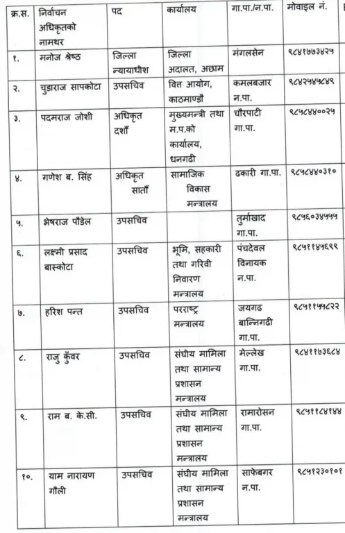 अछाम : जिल्लाका दश वटै पालिकामा निर्वाचन अधिकृतका कार्यालय स्थापना भएका छन् ।
