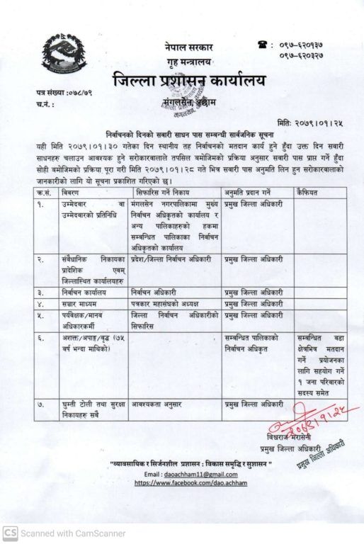 अछाम : आगामी वैशाख ३० गते शुक्रबार हुने स्थानीय तह निर्वाचन २०७९ मा सवारी साधन आवश्यक पर्ने सरोकारवालाले पास लिनुपर्ने भएको छ । निर्वाचनमा सवारी साधन आवश्यक पर्ने सरोकारवालाले बैशाख २८ गते भित्र जिल्ला प्रशासन कार्यालय अछामबाट पास लिईसक्नुपर्ने प्रमुख जिल्ला अधिकारी बिश्वराज मरासैनीले बताए ।