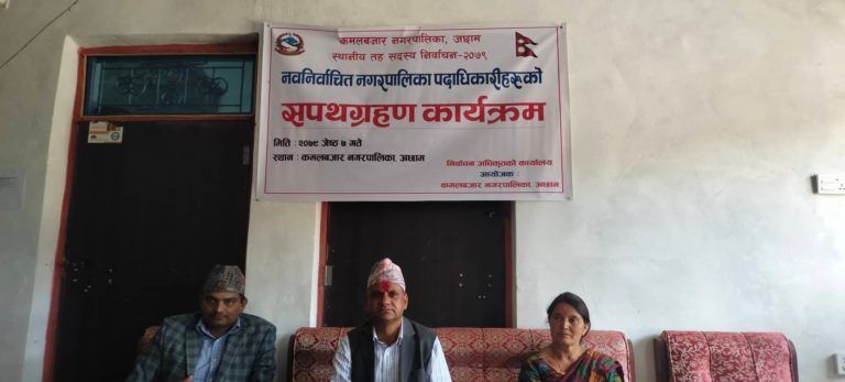 नगरपालिकाका नगर प्रमुख यज्ञ प्रसाद ढकालले आफुले जिल्लाको सदरमुकाममा मुख्य निर्वाचन अधिकृत मनोज श्रेष्ठबाट पद तथा गोपनियताको सपथ ग्रहण गरेपश्चात उनिहरुलाई कमलबजारमा सपथ ग्रहण गराएका हुन् ।