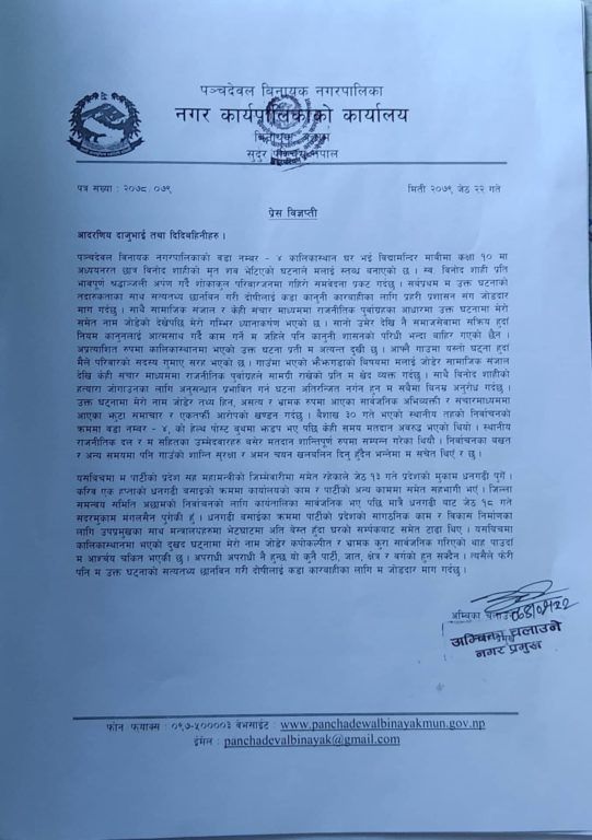 ‘सामाजिक संजाल देखि केही संचार माध्यममा राजनीतिक पुर्वाग्रहले आफ्नो नाम जोडेको भन्दै नगर प्रमुख चलाउनेद्धारा खेद व्यक्त‘