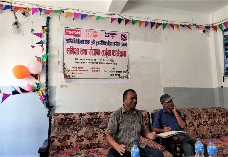नेपाल परिवार नियोजन संघ डोटी शाखाको आयोजनामा भएको कार्यक्रममा नगर प्रमुख राजेन्द्र कुवँर, उपप्रमुख शिब बहादुर कुवँर, १४ वटै वडाका अध्यक्ष लगायतको सहभागीता रहेको वडा नं. १२ खप्तडका वडाध्यक्ष जनक बहादुर कडायतले जानकारी दिए ।