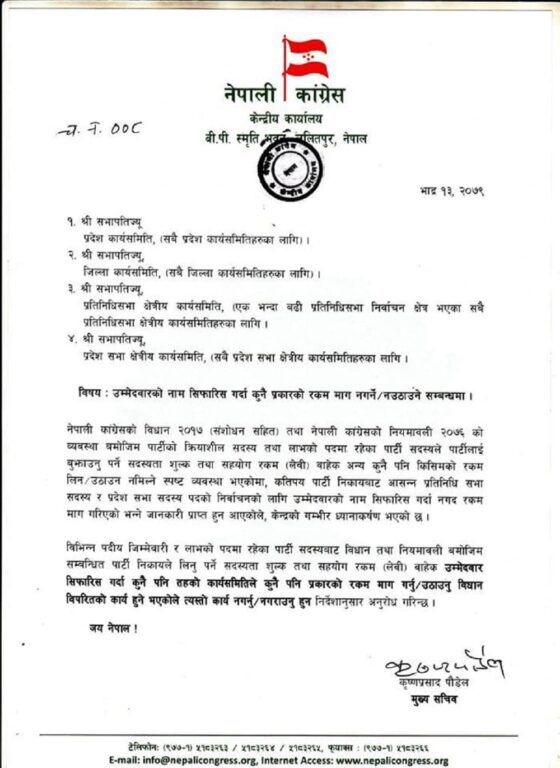 ‘विभिन्न पदीय जिम्मेवारी र लाभको पदमा रहेका पार्टी सदस्यबाट विधान तथा नियमावली बमोजिम सम्बन्धित पार्टी निकायले लिनु पर्ने शुल्क तथा सहयोग रकम ९लेबी० बाहेक उम्मेदवार सिफारिस गर्न कुनै पनि तहको कार्यसमितिले कुनै पनि प्रकारको रकम माग गर्नुरउठाउनु विधान विपरित कार्य हुने भएकाले त्यस्तो नगर्नु,नगराउनु हुन निर्देशानुसार अनुरोध गरिन्छ,’ मुख्य सचिव कृष्णप्रसाद पौडेलद्वारा हस्ताक्षरित पत्रमा लेखिएको छ।
