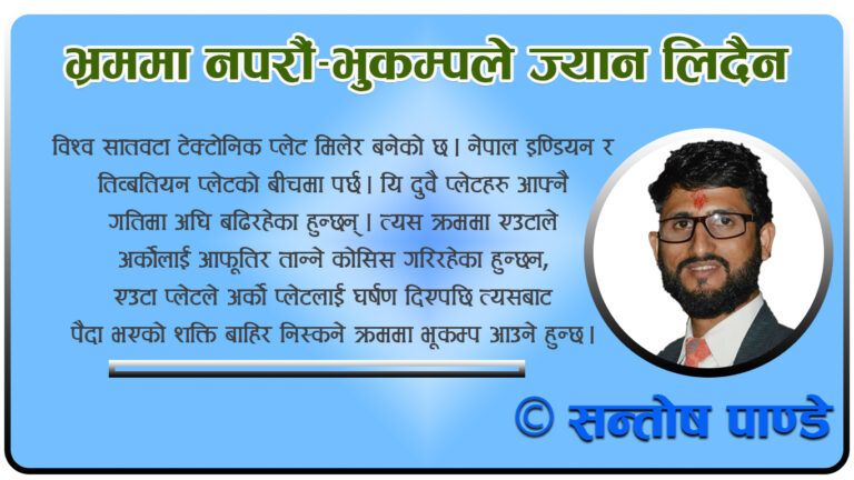 नेपालमात्र होईन, हिमालयन रेन्जका सबै क्षेत्र भुकम्पिय द्विष्टिले जहिल्यै उच्च जोखिममा छन । भुकम्पको सफल पुर्वानुमान गर्न सकिदैन तर हाम्रो क्षेत्रमा अवश्यम्भावी नै छ भन्न सकिन्छ, ढिलो चाडो मात्रै हो। अझ नेपालको पोखरा देखि पश्चिमी भागमा सन १५०५ देखि ठुलो भुकम्प गएको छैन । त्यस क्षेत्रमा विगतमा करिब पाँचसय बर्षमा ठुलो भुकम्प जान सक्ने गरि शक्ति सञ्चय भैरहेको धेरैजसो बैज्ञानिक अध्यनले देखाएका छन । हालै भेरहेका बिभीन्न अध्यनहरुले पनि सो क्षेत्रमा ठुलो भुकम्प जान सक्नेगरि जमिनमा शक्ति संञ्चय भएको देखाएका छन । भुकम्पिय जोखीमलाई मध्यनजर गर्दै समुदायस्तरबाटै जनचासो र पुर्वतयारी तथा भुकम्प प्रतिरोधि निर्माणलाई प्राथामिकताका साथ अगाडि बढाउनु निकै नै जरुरी छ।