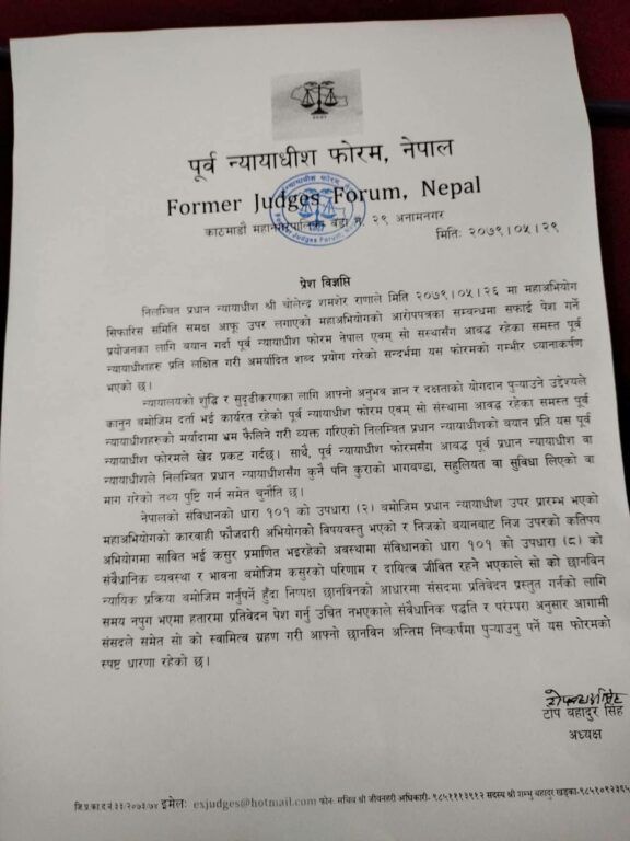 विज्ञप्तिमा भनिएको छ, ‘निलम्बित प्रधान न्यायाधीशको बयानप्रति पूर्व न्यायाधीश फोरमले खेद प्रकट गर्दछ। साथै, पूर्व न्यायाधीश फोरमसँग आवद्ध पूर्व प्रधान न्यायाधीश वा न्यायाधीशले निलम्बित प्रधान न्यायाधीशसँग कुनै पनि कुराको भागबण्डा, सहुलियत वा सुविधा लिएको वा माग गरेको तथ्य पुष्टि गर्न समेत चुनौति छ।’