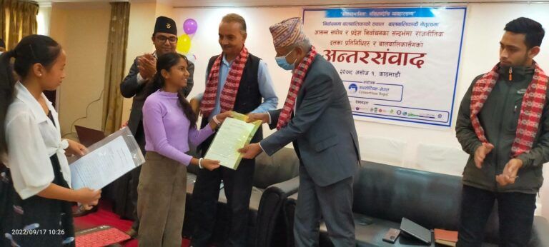 काठमाडौं: निर्वाचनमा बालबालिकाहरुको प्रयोग नगर्न आग्रह गरिएको छ । नेपालको सातै प्रदेशका बालबालिकाहरुको प्रतिनिधित्व रहेको बाल पैरवी परिषद् कन्सोर्टियम नेपालले शनिबार राजधानीमा आयोजना गरेको कार्यक्रममा आसन्न आम निर्वाचनको सन्दर्भमा राजनीतिक दलहरुसँग अन्तरसंवाद गर्दै उक्त सुझावहरु बुझाइएको छ ।