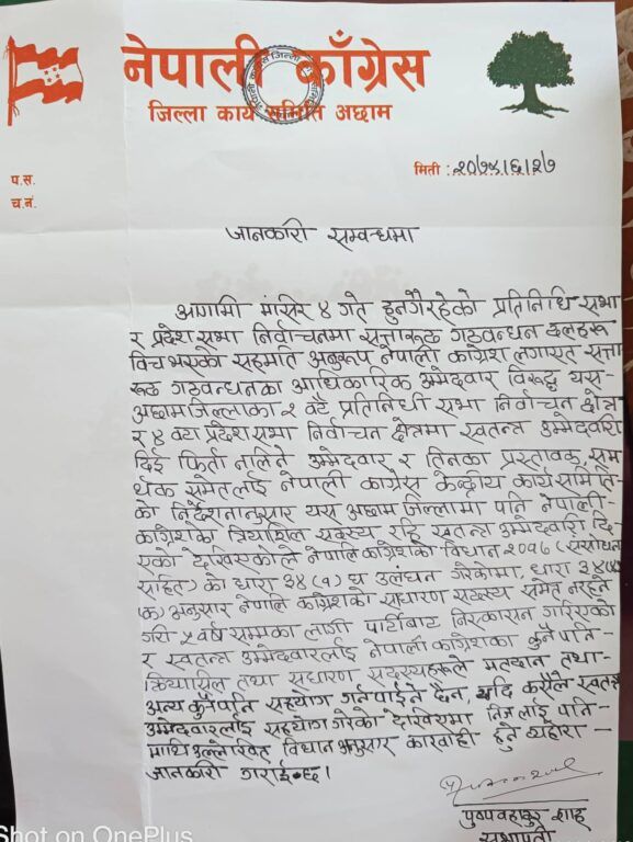 बिहिबार एक सुचना जारी गर्दै कांग्रेस अछामले गठबन्धका आदिकारिक बिरुद्ध अछाम जिल्लाका दुबै निर्वाचन क्षेत्र तथा ४ वटै प्रदेश सभामा पार्टीको सदस्य भई स्वतन्त्र उम्मेद्धारी दिनेलाई कारबाही गरेको हो भने स्वतन्त्र उम्मेद्धारका प्रस्तावक र सर्मथकलाई समेत कारबाही गरिएको छ ।