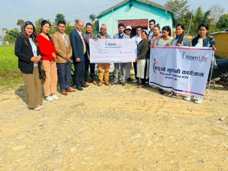 सुर्खेत । सिटिजन लाईफ इन्स्योरेन्स कम्पनी लिमिटेड वीरेन्द्रनगर शाखाले बिमा दावी रकम भुक्तानी गरेको छ । वीरेन्द्रनगर नगरपालिका ९ सुर्खेतका बिमित स्वर्गीय जगतबहादुर शाहीको परिवारलाई सिटिजन शुभारम्भ योजना अन्तर्गत १० लाख (पाँच पाँच लाखका दुईओटा विमा पोलिसी) बिमांक रकम र काजकिरिया खर्च वापतको एक लाख गरी कुुल ११ लाख रकम शाहीकी श्रीमती रत्ना शाहीलाई घरमै पुगेर हस्तान्तरण गरिएको हो ।