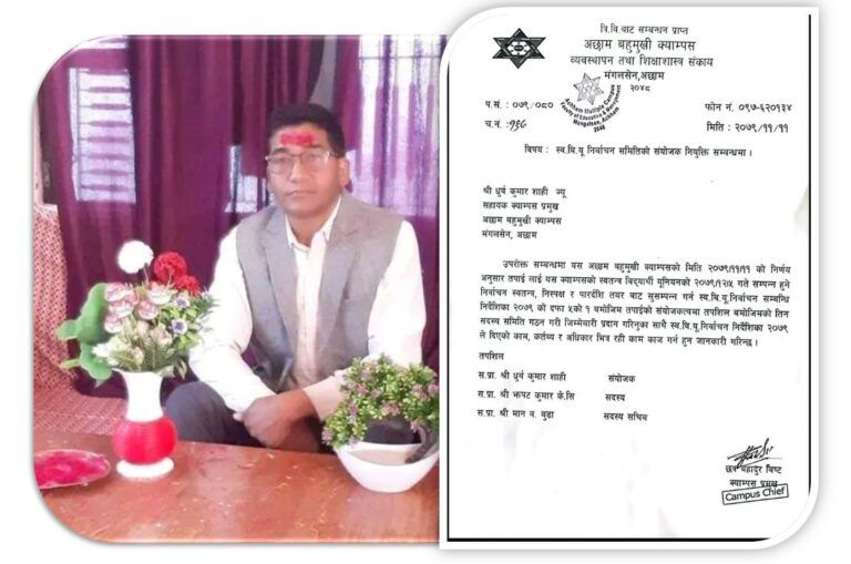 स्ववियु निर्वाचन सम्बन्धी निर्देशिका २०७९ को दफा ५ को १ बमोजिम क्याम्पसका सहायक क्याम्पस प्रमुख धु्रर्व कुमार शाहीलाई संयोजकमा न्यूक्त गरिएको क्याम्पस प्रमुख छत्र बहादुर बिष्टले बताए ।