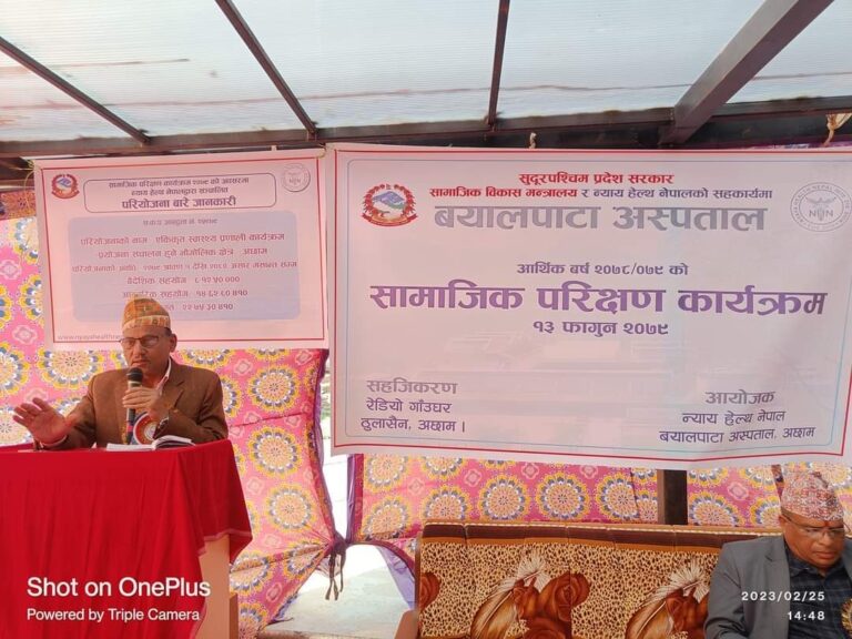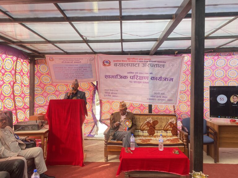 बयालपाटा अस्पतालको आर्थिक बर्ष २०७८÷७९ को सामाजिक परिक्षण कार्यक्रममा प्रमुख अतिथिको आशनबाट बोल्दै प्रतिनिधिसभा सदस्य शाहले अस्पतालमा दक्ष जनशक्ति सहित आवश्यक उपकरणको व्यवस्थापन गर्नका लागि नेपाल सरकार संग जोडदार संग माग गर्ने प्रतिबद्धता जनाउनु भएको छ ।