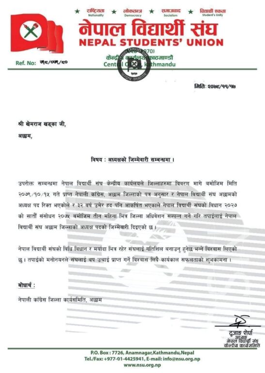 अछाम । नेपाल बिद्यार्थी संघ अछामको अध्यक्षमा खेमराज खड्का चयन भएका छन् । जिल्लाको चौरपाटी गाउँपालिका निवासी खड्का नेपाली काँग्रेसको भातृ संगठन ने.बि.संघमा लामो समय देखि सक्रिय भुमिकामा छन् ।