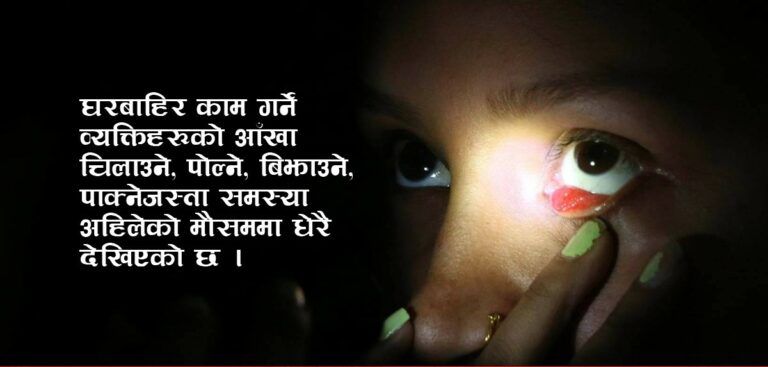 काठमाडौं । सुख्खायाममा आँखामा विभिन्न समस्याहरु देखिएकोे धेरैको अनुभव हुन्छ । घरबाहिर काम गर्ने व्यक्तिहरुको आँखा चिलाउने, पोल्ने, बिझाउने, पाक्नेजस्ता समस्या अहिलेको मौसममा धेरै देखिएको छ ।