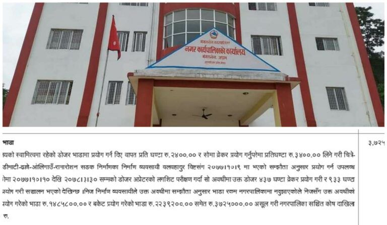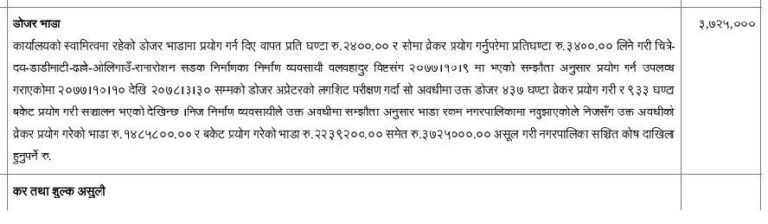 नगरपालिकाले एक निर्माण व्यवसायी सँग गरेको सम्झौता अनुसार डोजर चलेबापत ३७ लाख रकम भाडा असुली नगरेको हो ।आर्थिक वर्ष २०७७/७८ मा नगरपालिकाको डोजर प्रयोग गरेका निर्माण व्यवसायीले भाडा समेत दिएका छैनन् ।