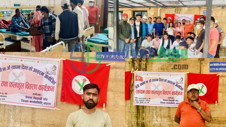 अछाम । नेपाल बिद्यार्थी संघ अछामले बयालपाटा अस्पतालमा रक्तदान तथा अस्पतालमा भर्ना भएका बिरामीलाई फलफुल बितरण गरेको छ । संघको ५४ औँ स्थापना दिवसको अवसरमा रुक्तदान तथा अस्पतालका बिरामीलाई फलफुल वितरण गरिएको हो ।