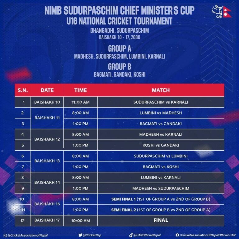 वैशाख १७ गतेसम्म सुदूरपश्चिम प्रदेशमा आयोजना हुने प्रतियोगितामा सात प्रदेशको टोलीबीच प्रतिस्पर्धा हुने नेपाल क्रिकेट संघ क्यानले जनाएको छ । सात टोलीलाई दुई समूहमा विभाजन गरिएको छ ।