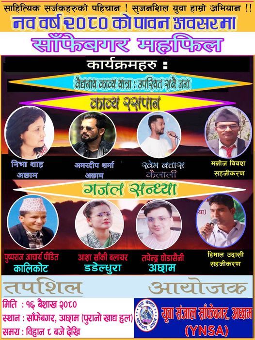 साहित्यक सर्जकहरुको पहिचान, सृजनशिल युवा हाम्रो अभियान भन्ने मुख्य नाराका साथ साँफेबगर नरग युवा सञ्जाललको आयोजनामा साँफेबगर मेहफिल हुन लागेको हो । नयाँ बर्ष २०८० को शुभ अवसरमा १६ गते शनिबार हुने साँफेबगर मेहफिलमा बैद्यनाथ काव्ययात्रा, काव्य रसपान र गजल सन्ध्याका कार्यक्रम रहेका युवा सञ्जालका अध्यक्ष भुपेन्द्र भण्डारीले बताए ।