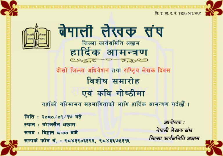 उक्त कार्यक्रममा साहित्यप्रेमी तथा नेपाली लेखक संघ प्रति शुबेच्छुक सबैलाई सहभागीताका लागि आमन्त्रण गरिएको नेपाली लेखक संघ अछामले जनाएको छ ।