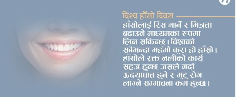काठमाडौं – आज विश्व हाँसो दिवस। हाँसो एक प्रकारको सकारात्मक अनि शक्तिशाली भाव हो। यो जो कोहीमा हुनु आवश्यक छ। यसले जीवनमा रस अनि आशा थप्दै जाने प्रेरणा दिन्छ। हाँसो मानिसको मनमा उब्जने भावना हो।