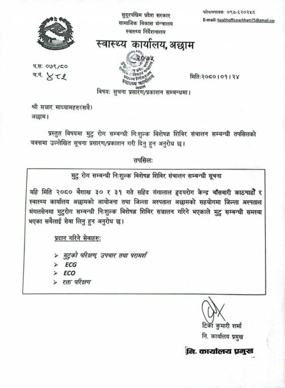 शिविरमा मुटुरोग बिशेषज्ञबाट मुटुको परिक्षण तथा परार्मश, ईसिजी, ईको तथा रक्त परिक्षण हुने स्वास्थ्य कार्यालय अछामले जनाएको छ ।