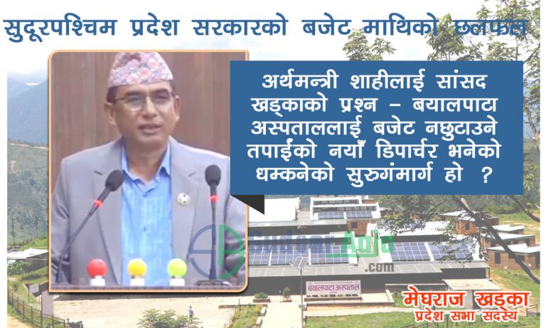 बजेटको साङगोपाङग अध्यन गरेर आएका उनले मुख्यमन्त्री र आर्थिक मामिला मन्त्री प्रति जनजीवन संग जोडिएका गहकिला प्रश्न तेर्साए । बिहीबार प्रदेशसभा बैठकमा बजेटमाथिको छलफलमा भाग लिने क्रममा खड्काले प्रश्न गरे ” आर्थिक मामिला मन्त्री ज्यु बजेटमा नयाँ डिपार्चर भन्नुहुन्थ्यो तपाईंको नयाँ डिपार्चर भनेको जनतलाई स्वास्थ्य सेवा बाट बन्चित गराउनु रहेछ ।