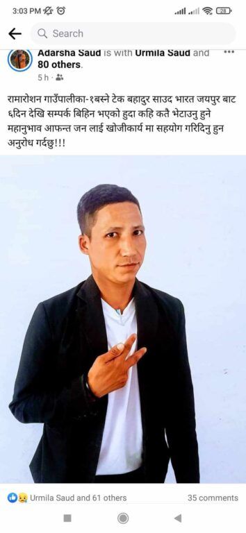 उनी भारतको जयपुरबाट गएको ६ दिनदेखि सम्पर्क बिहिन भएका उनका आफन्तले बताएका छन् ।