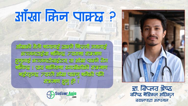 बर्षायाम सुरु भएपछि अहिले बिभिन्न खालका सरुवा रोग फैलिनेक्रम बढीरहेको छ । खासगरी पहाडी तथा तथा तराई क्षेत्रमा सरुवा रोग संक्रमण बढी देखिएको छ । बर्षायामले गर्दा पानी फोहोर हुने, खाल्डाखुल्डीमा पानी जम्ने, दुषित कुराहरु पानीमा बगेर आउने भएकाले पनि सरुवा रोगहरु बढी फैलिने गरको चिकित्सकहरु बताउछन् । पछिल्लो सयममा अछाम जिल्लामा आँखा पाक्ने रोग फैलिएको छ । जिल्लाको साँफेबगर लगायतका अन्य ठाँउमा समेत भाईरलका रुपमा आँखा पाक्ने रोग फैलिएको छ । आँखा पाक्ने रोग भनेको के हो ? यो किन हुन्छ, भईसकेपछि के गर्ने भन्ने बिषयमा बयालपाटा अस्पतालका बरिष्ठ मेडिकल अधिकृत डा. बिप्लव श्रेष्ठसंग गरिएको कुराकानी ।