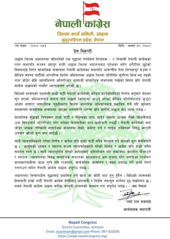 नेपाली कांग्रेसको नाम जोडेर सामाग्री सामाजिक संजालमा भाम्रक तरिकाले लेख्ने, कमेन्ट गर्ने र लाईक गर्नेहरुका विरुद्ध कानुनी उपचार खोज्ने कार्यबाहक सभापती नयाँराम बजगाईद्धारा हस्ताक्षरित विज्ञप्तीमा भनिएको छ । कांग्रेसको सांगठनिक सुदृढीकरण विशेष आन्तरिक अभियानलाई प्रभावित गर्ने गरि कुल्सित मनसायले सामाजिक संजालमा आएका मनगणन्ते धारणा आएको भन्दै कांग्रेस अछामले विज्ञप्ती मार्फत खेद व्यक्त गरेको छ ।
