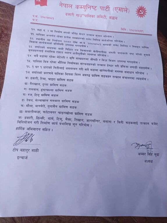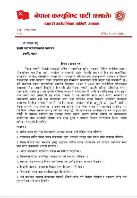 आम जनताले स्थानीय सरकारको प्रत्याभूत गर्न नपाएको र पालिका भित्र थुप्रै बेथिति भएको आराेप लगाउँदै नेपाल कम्युनिस्ट पार्टी एमाले ढकारी गाउँकमिटिले मंगलबार १७ बुदे माग राख्दै गाउँपालिका अध्यक्ष लाई ज्ञापनपत्र बुझाएको हाे ।