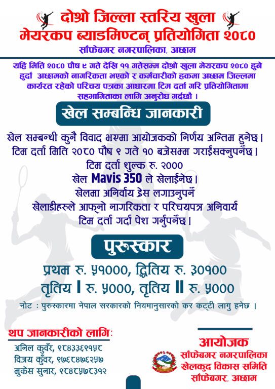 अछाम : जिल्लाको साँफेबगरमा दोश्रो जिल्ला स्तरिय खुला मेयरकप ब्याटमिण्टन प्रतियोगिता २०८० हुने भएको छ । साँफेबगर नगरपालिकाको आयोजनामा यहि पौष ९ देखि ११ गते सम्म प्रतियेगिता सञ्चालन हुने साँफेबगर खेलकुद विकास समितीका अध्यक्ष अनिल कुँवरले बताए ।