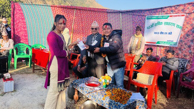 वडा नम्बर -६ ताेलीमा रहेको वसन्त बचत तथा ऋण सहकारी संस्था लिमिटेडको १३ औ साधारण सभाको अवसरमा उनीहरू लाई बचत बुक हस्तान्तरण गर्दै उनीहरूको नाममा बचत गरिदिने प्रतिबद्धता जनाएको वडा अध्यक्ष कमल रावलले सुदूरआज लाई जानकारी दिए ।