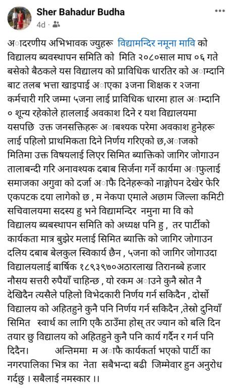 सामाजिक सञ्जालमा आएका विभिन्न खाले टिप्पणीहरूको विद्यालय व्यवस्थापन समितिका अध्यक्ष सेर बहादुर बुढाले सामाजिक सञ्जाल बाट नै खण्डन गरेका छन् । उनले ज्यानको बलि दिन तयार रहेको तर विद्यालयको अहित हुने कुनै पनि निर्णय नगर्ने तर्क दिएका छन् । आफू एमालेको जिल्ला कमिटी सचिवालय सदस्य भएको कारण आफूसँग राजनीतिक प्रतिशोध साध्ने गरेको र कुनै पनि राजनीतिक दबाबको आफूलाई स्वीकार्य नहुने उनको जिकिर छ । विद्यालयमा आम्दानीको स्रोत नभएका कारण कर्मचारी हटाउनु परेको उनले उल्लेख गरेका छन् ।