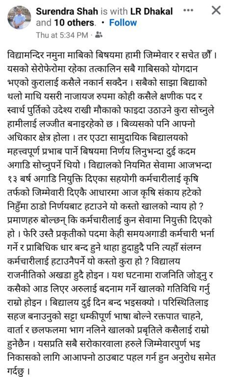 प्राविधिक तर्फका ५ जना कर्मचारीहरू पाल्नलाई वार्षिक अठार लाख तिरानब्बे हजार नौ सय सत्तरी रुपैयाँ आवश्यक पर्ने हुँदा स्रोत जुटाउन नसकिने भन्दै कर्मचारी हटाउनु पर्ने निर्णय गरेको उनले लेखेका छन् । अन्तमा राजनैतिक भाषामा लेख्छन् आफ्नै पार्टी एमालेका नेताहरू आफ्नो निर्णय विरुद्ध टीकाटिप्पणी गरेको आशय व्यक्त गर्दै “आफ्नै पार्टीका नेताहरू जिम्मेवार हुन आग्रह गर्दछु ।”